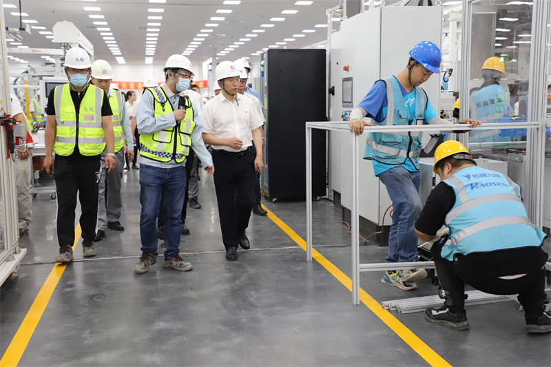 随后,一行人来到繁荣智能制造产业园项目,听取了长发新能源公司关于项目概要、施工建设、投资进度等情况的汇报,通过无人机实时观看了项目全貌,并深入厂区焊装、电池电驱、总装车间,详细了解各车间功能,近距离感受焊装机器人、电驱生产系统、总装主线等工艺设备,同时参观了待上市的红旗品牌新款车型。