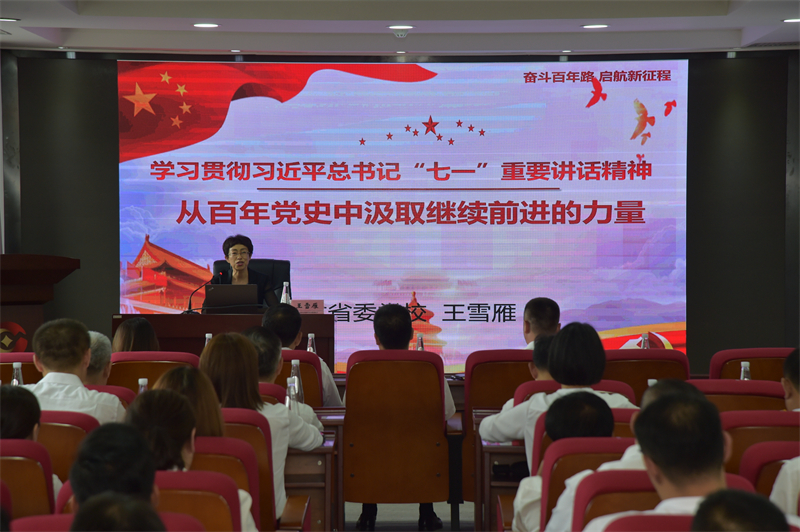 为深入学习贯彻习近平总书记“七一”重要讲话精神,重温党的百年光辉历程和伟大成就,弘扬党的光荣传统,传承党的宝贵经验,坚定不移走好实现第二个百年奋斗目标新征程。7月14日,6686体育党委组织召开党史学习教育专题学习会7月份理论学习中心组(扩大)会,认真学习贯彻习近平总书记在庆祝中国共产党成立一百周年大会上重要讲话精神。省委党校经济学部主任王雪雁教授应邀做专题解读。集团党委委员、领导班子、中层干部、各级党组织书记近百人参加学习会。