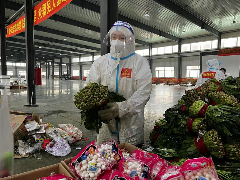 其实谁也不知道,在他报名的时候,他的双脚犯痛风刚刚初愈不到一天,所以第二天他出行的时候,穿着防护服的他是一瘸一拐开展蔬菜分拣工作的。连续两天工作下来,除了浑身汗流浃背,就是他的双脚肿的跟馒头一样。但他却忍痛坚持在分拣现场从事蔬菜打包、运输、系袋等工作。直到每天休息的时候,他才会把鞋脱下来一会缓解一下双脚的疼痛,他的这种顽强的精神感动了很多志愿者。