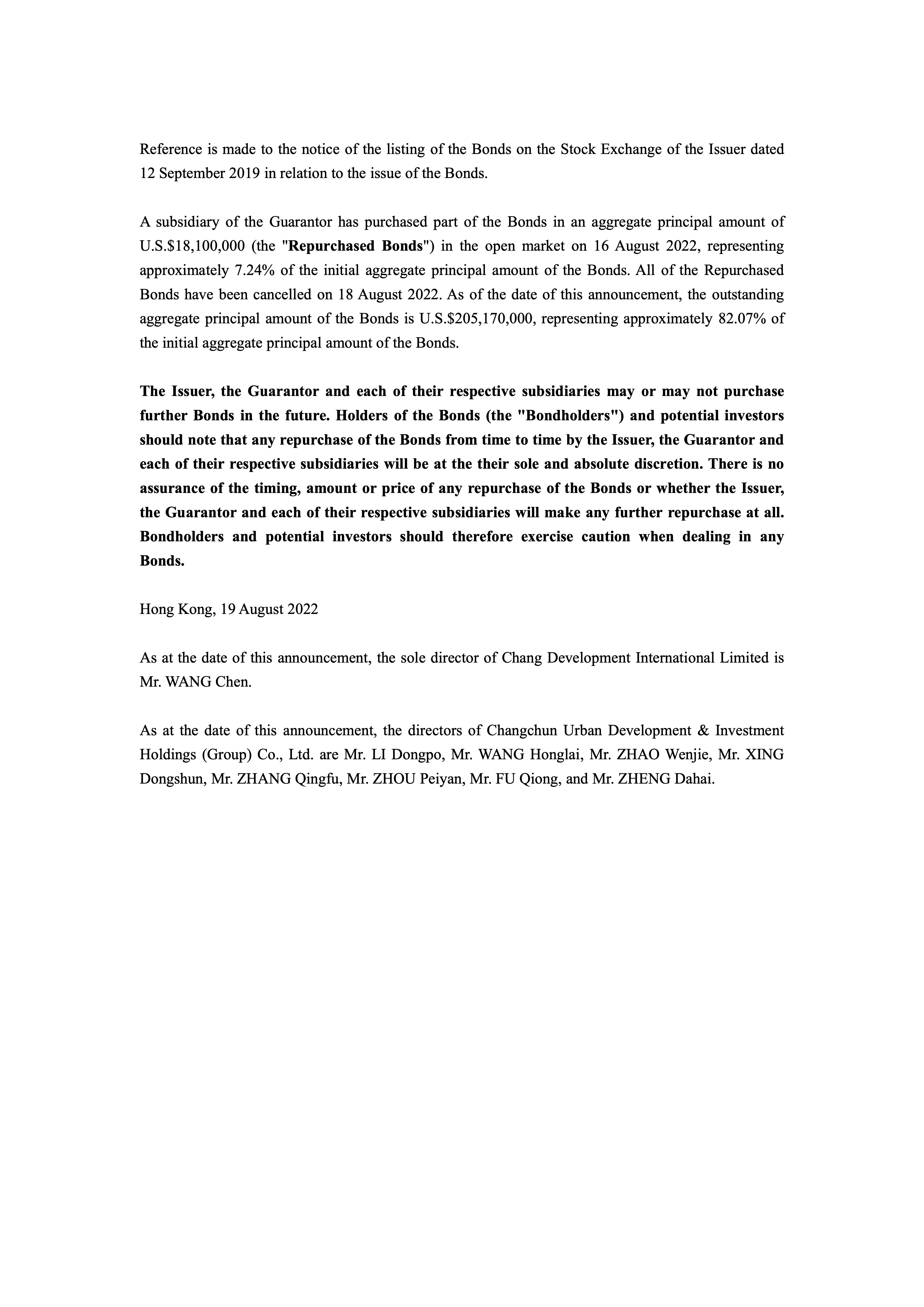 CHANG DEVELOPMENT INTERNATIONAL LIMITED CANCEL PART OF THE BOND