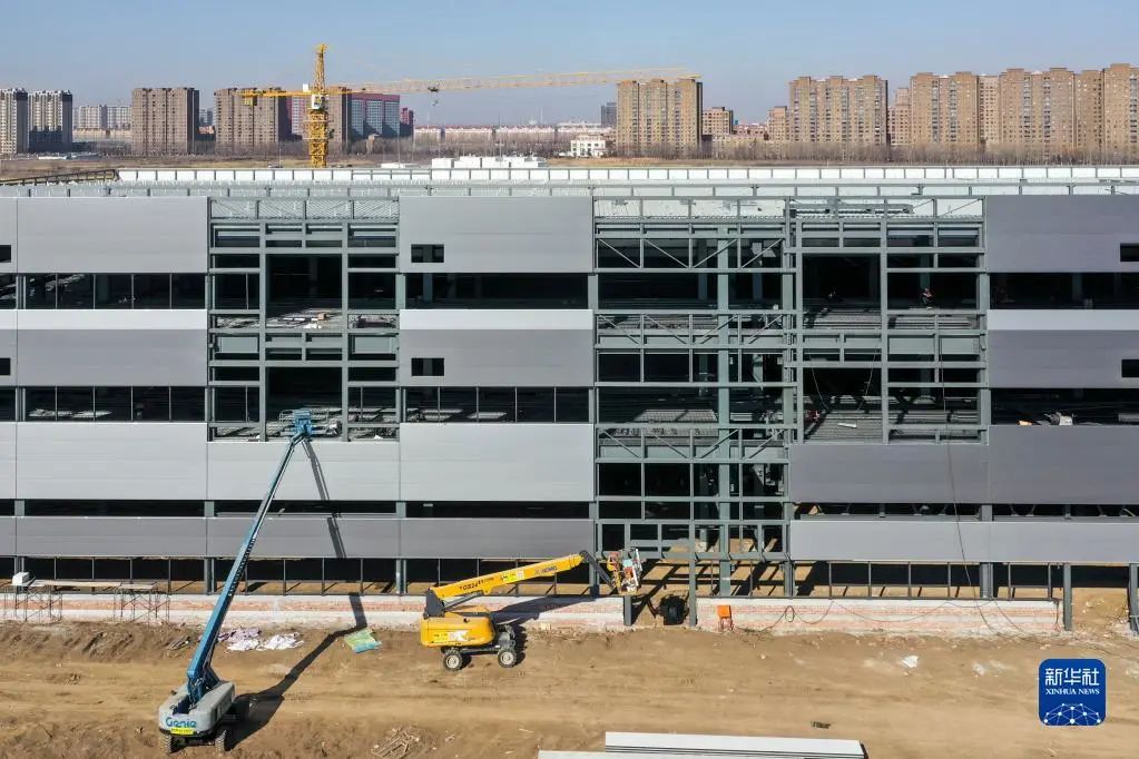 图片工人在奥迪一汽新能源项目建设现场施工(1月31日摄,无人机照片)。新华社发 (王勐摄)