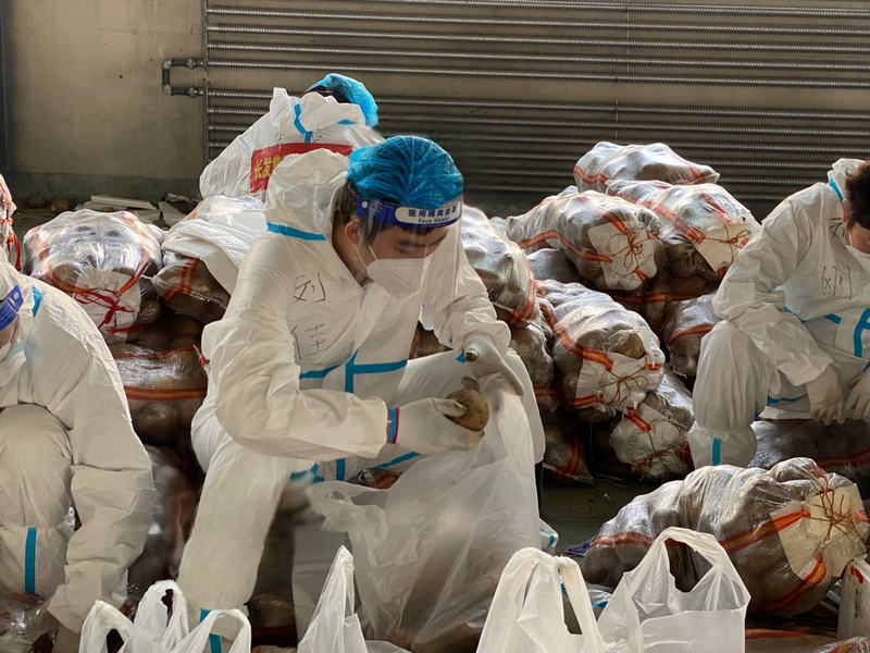 其实谁也不知道,在他报名的时候,他的双脚犯痛风刚刚初愈不到一天,所以第二天他出行的时候,穿着防护服的他是一瘸一拐开展蔬菜分拣工作的。连续两天工作下来,除了浑身汗流浃背,就是他的双脚肿的跟馒头一样。但他却忍痛坚持在分拣现场从事蔬菜打包、运输、系袋等工作。直到每天休息的时候,他才会把鞋脱下来一会缓解一下双脚的疼痛,他的这种顽强的精神感动了很多志愿者。