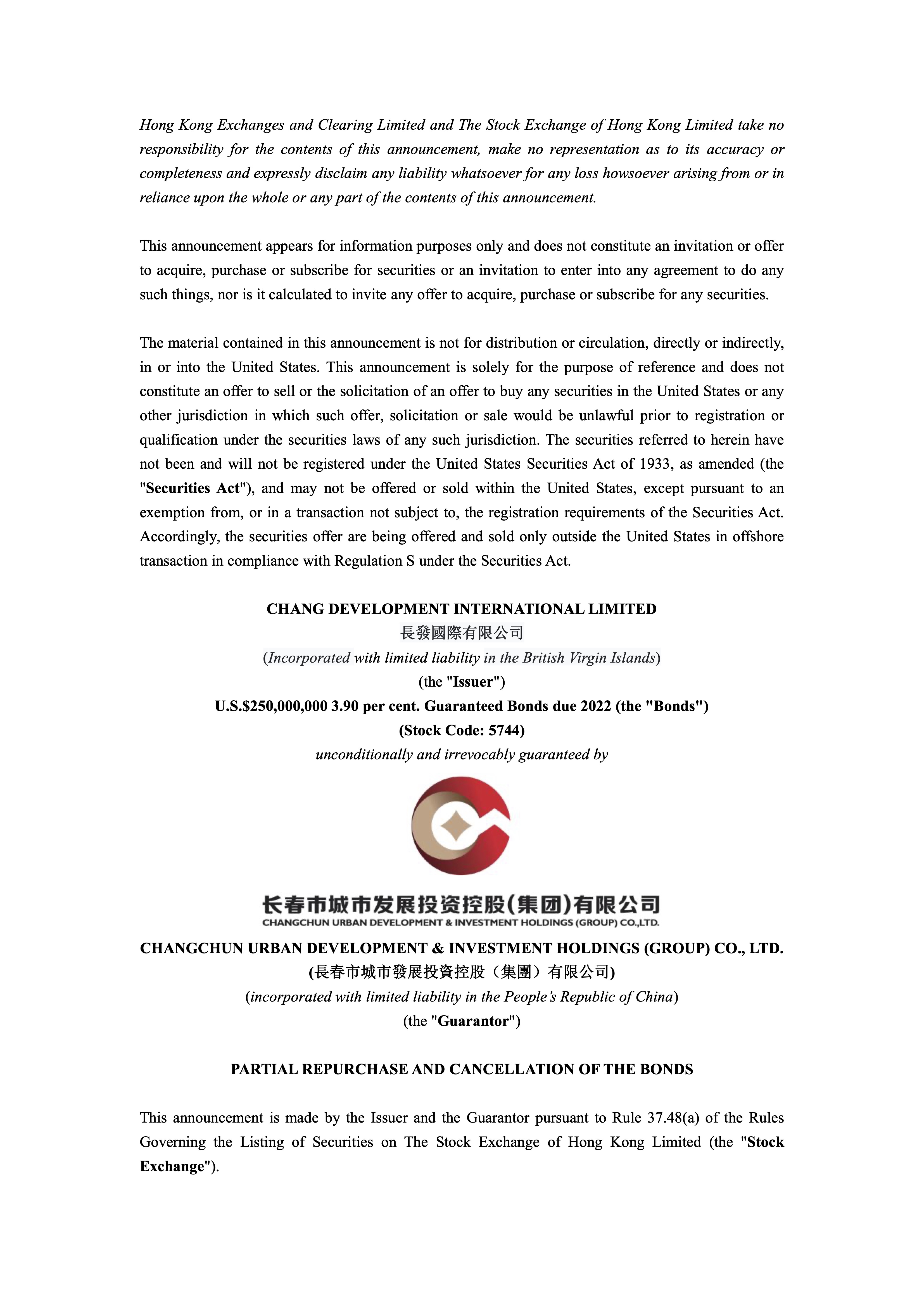 CHANG DEVELOPMENT INTERNATIONAL LIMITED CANCEL PART OF THE BOND