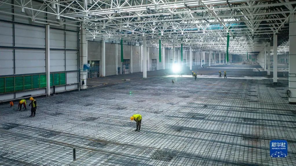 图片工人在奥迪一汽新能源项目建设现场施工(1月31日摄,无人机照片)。新华社发 (王勐摄)