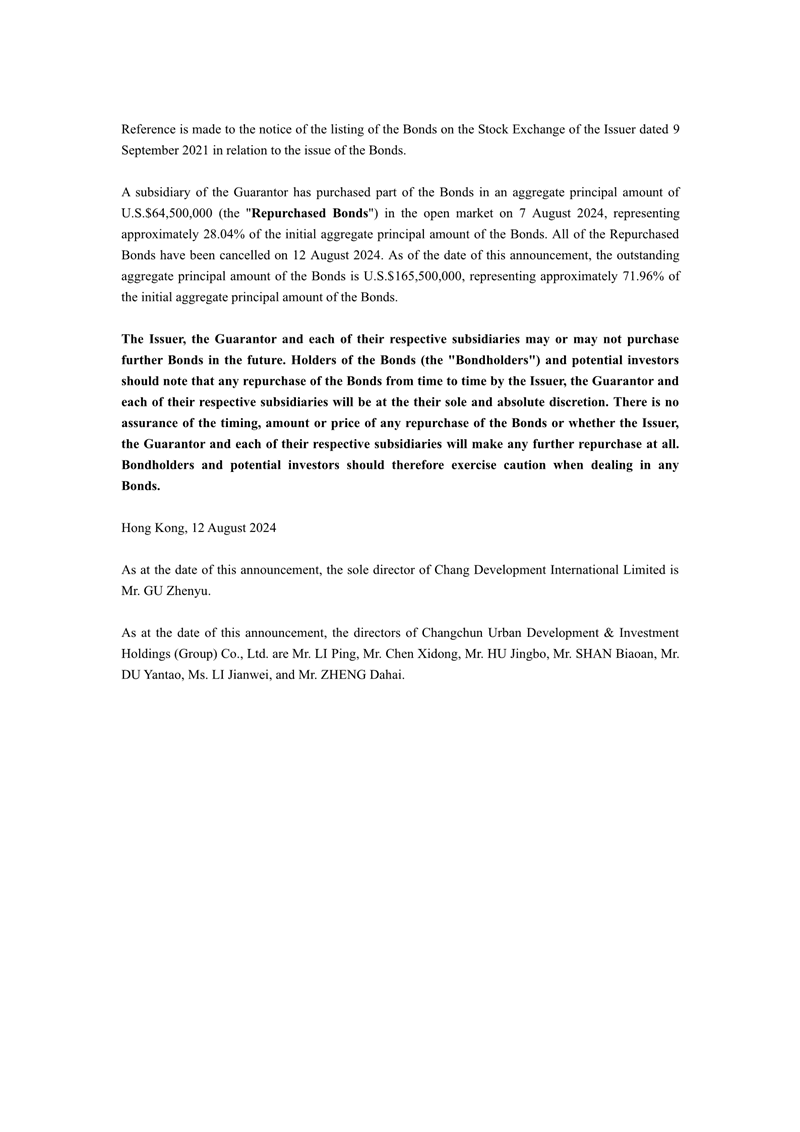 上一篇:Chang Development International Limited - Partial Repurchase and Cancellation Announcement